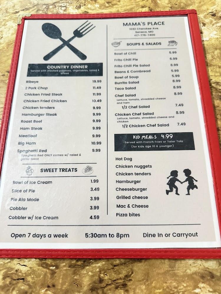 Welcome to Mama's Place, your cozy diner in Seneca, MO, where great food meets friendly service. Located at 1032 Cherokee Ave, we are known for our delicious breakfast, lunch, and dinner offerings, all at budget-friendly prices. Enjoy our specialties in a relaxed atmosphere, perfect for solo diners or groups. Our accessible facility ensures everyone can savor our excellent coffee and local favorites. With options for dine-in, take-out, and delivery, Mama's Place is here to satisfy your cravings. Come experience our charming locale and taste the warmth that makes us a beloved community spot!
